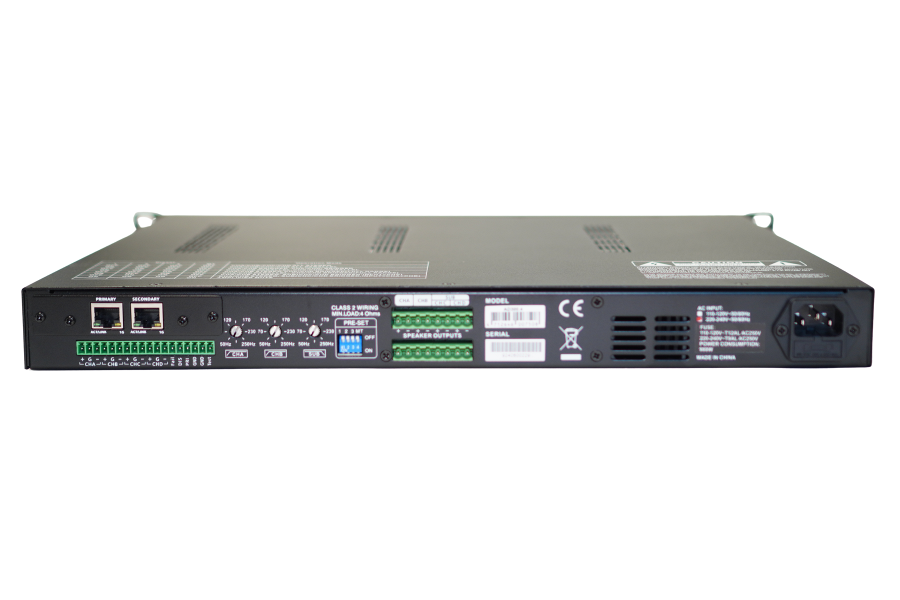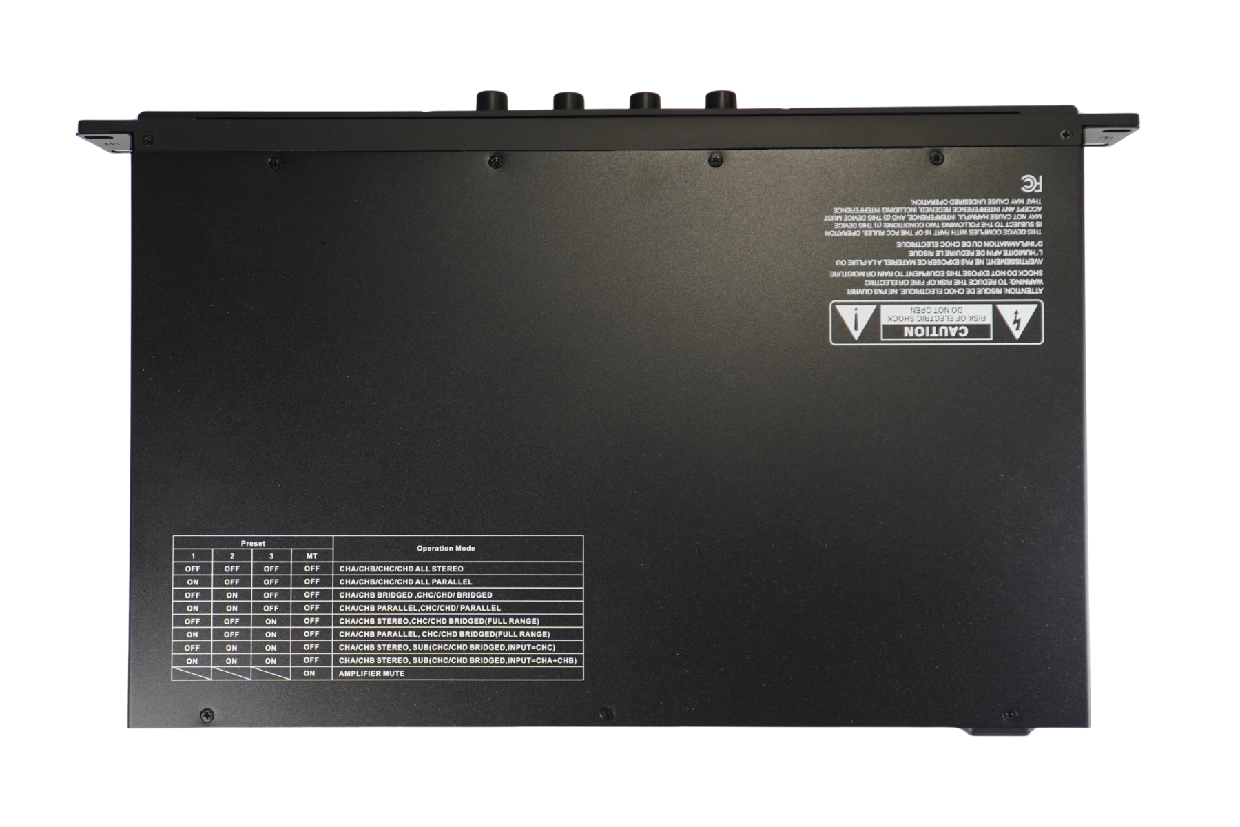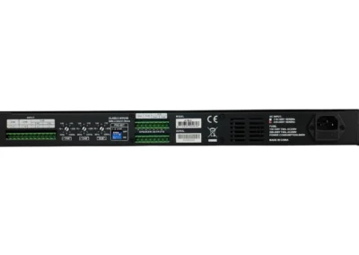 4 csatornás hidalható erősítő 1U magas, rack szekrénybe való kialakítással.