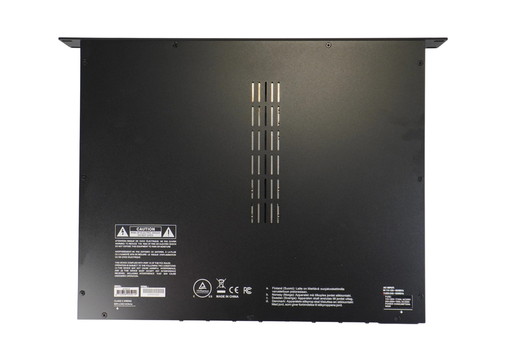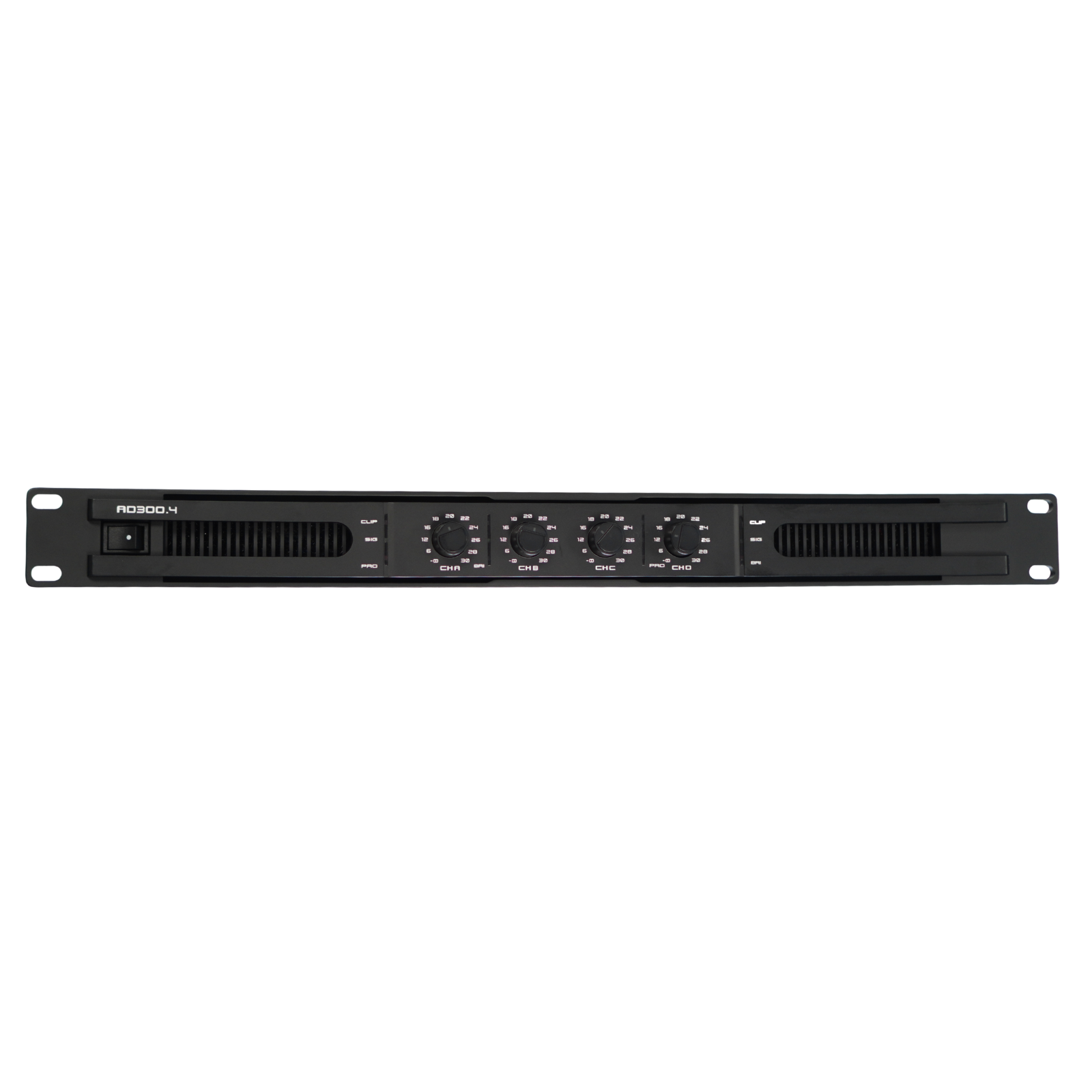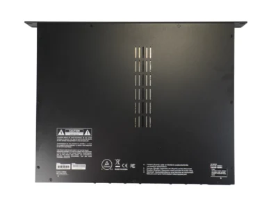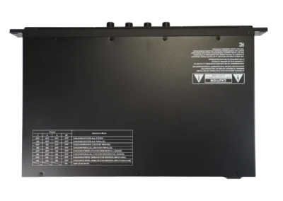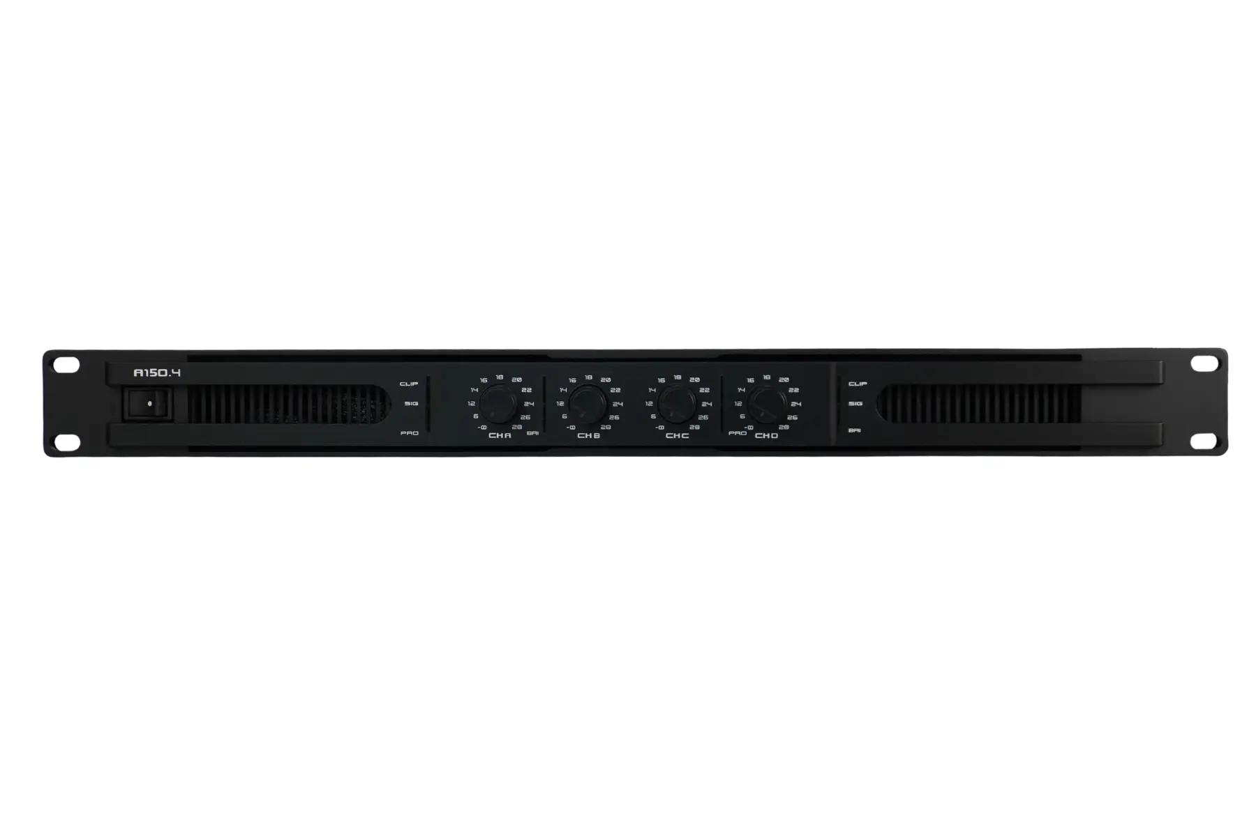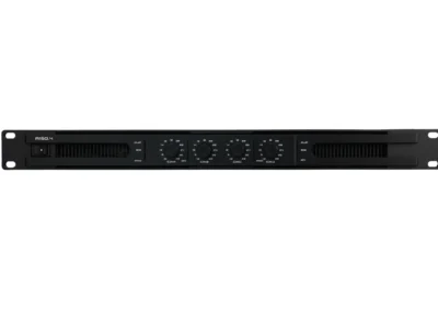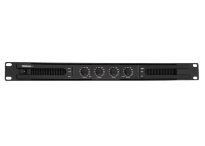 4 csatornás erősítő 1U magas, rack szekrénybe való kialakítással.