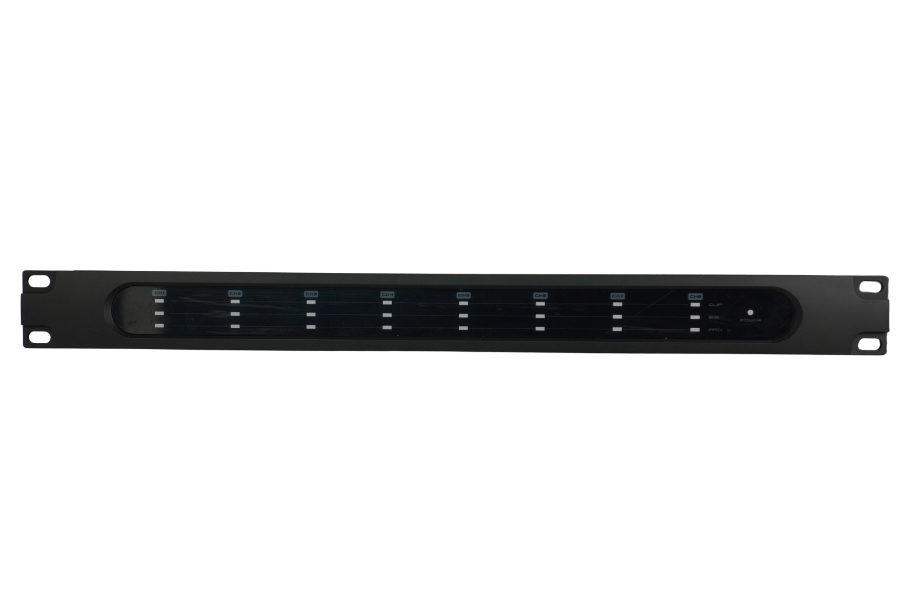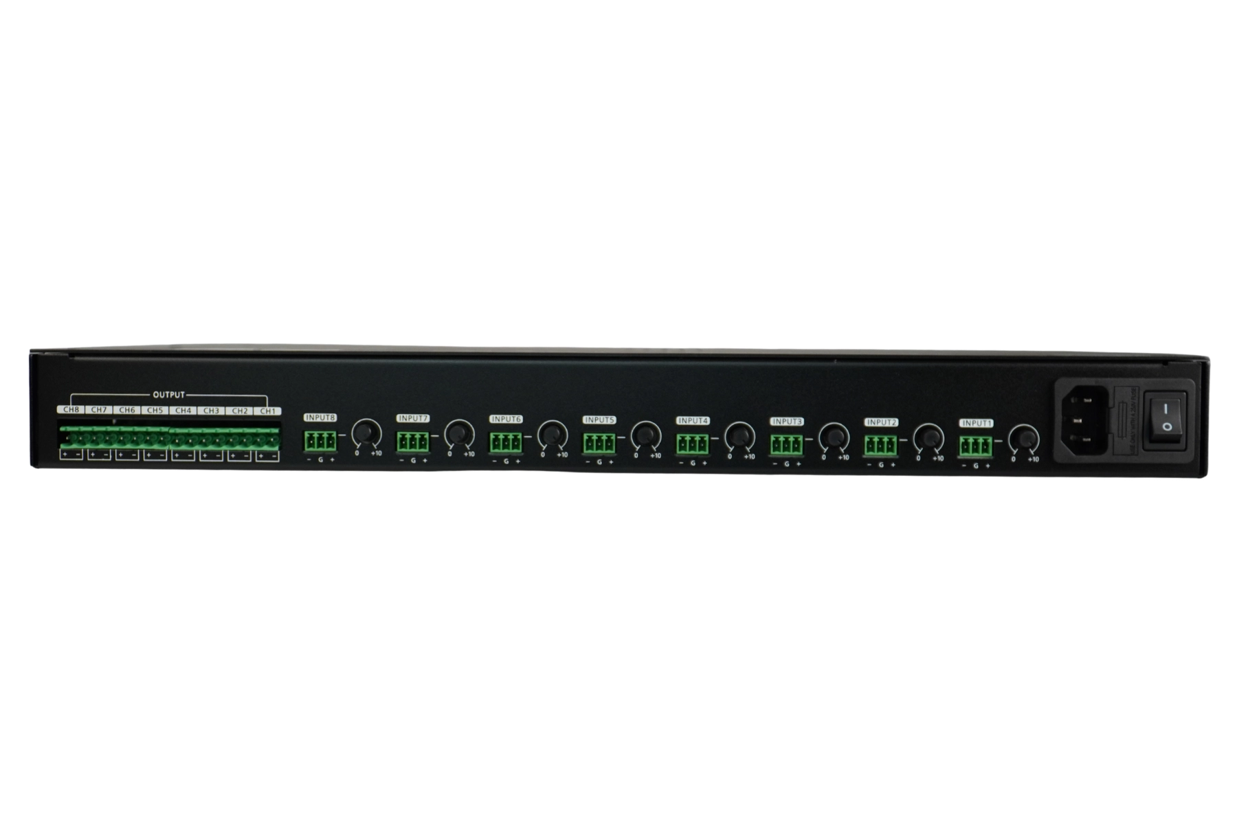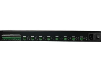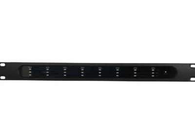 8 csatornás erősítő 1U magas, rack szekrénybe való kialakítással.